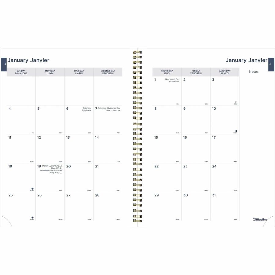 - Calendars of past and following months on each spread