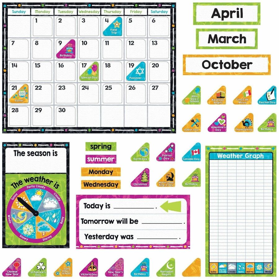 Celebrate special days and learn calendar basics in colorful style! 17½ inch x 23¼ inch calendar, 12 month labels, 7 days of the week labels, 4 seasons labels, season/weather chart, 33 date markers, 44 holiday/special day markers, Today/Tomorrow/Yesterday chart, weather graph, and 2 arrows.